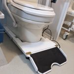 A client with MS has a toilet that has been raised to assist transfers, meaning her feet are unsupported. Because she has to spend long periods on the toilet, this is painful and a movable footrest was required. Her reduced strength means this must be motorised. A hinged flap was made, lifted by an airbag and battery-powered tyre pump.