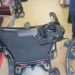 The client has a powerchair which he can mostly control himself, however he is unable control it confidently in tight spaces. A bracket was added to the rear push bar so that the controler can be easily moved to be operated by a carer.