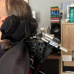 A motorised headrest allows a power chair user to change head position forward or backward to reduce pain during some daily activities, including eating.