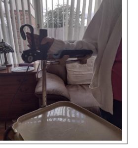 The Community Physiotherapist referred our client, Olwyn, to REMAP. Olwyn uses a kitchen trolley and needs to rest her forearms on its handlebars for support. The Community Physiotherapist thought she would benefit from gutter arm supports being fitted, which are not currently available in the NHS. This adaptation, if possible, would also enable her to adopt a more upright posture.