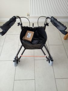 The client wished to be able to walk without hesitation, using her rollator and Zimmer frame. They needed a prompt in the form of a physical line to enable them to take a step. The commercial laser line we had, was for a walking stick – perhaps it could have been adapted, but it only triggered to display the line, when it felt sufficient vibration – we were not convinced that there would be enough vibration if we fitted it to the rollator.
