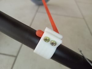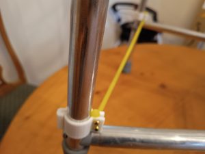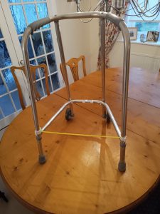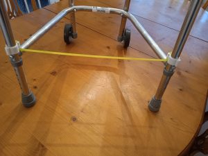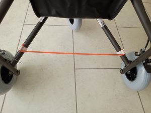 The client needed a visual prompt in the form of a line on the ground to enable her to take a step with her rollator. Initially we thought of a laser, but the OT felt that a physical line in the form of an elastic tube might work. This was produced, and was so successful that we also fitted the same idea to her Zimmer frame for use upstairs in her house.