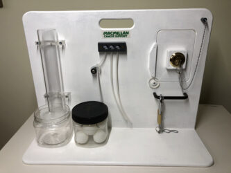 Three lengths of cord (4 mm diameter) for plaiting and knot tying.Conventional fibre cord could not be used because of difficulties in cleaning this material, so silicone rubber cord was sourced for this purpose. The cord was found to work very well in tying knots. An acetyl post (about 15 mm diameter) was attached to the board to allow hitches of different types to be tied.