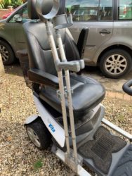 The client requires a bracket to hold his crutches, but mounted in front of the seat. The area behind the seat (where commercial brackets are usually fitted) is taken up by a cargo basket.