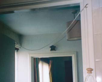 A very simple arrangement was set up with a length of nylon cord attached to the door and taken over a cup hook screwed into the inner doorframe.