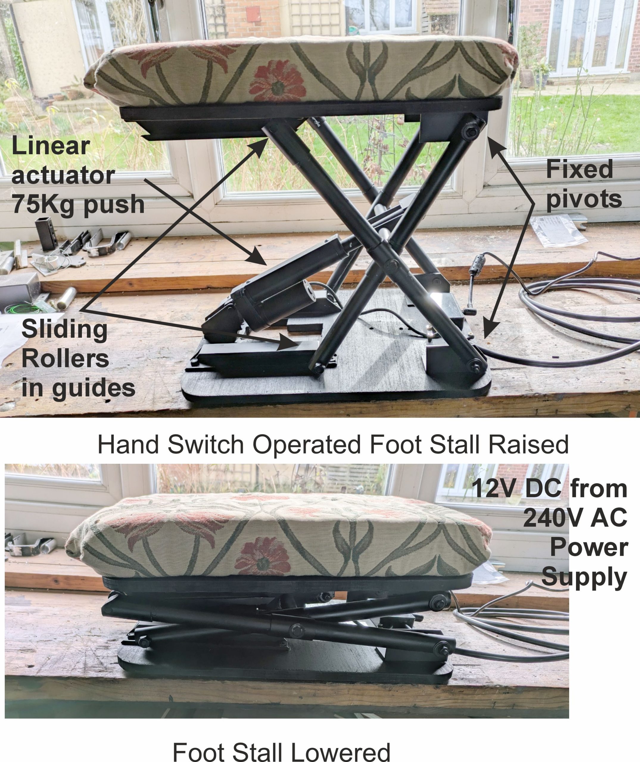 A hand switch operated, raising foot stool, was made, with a lowest setting of 150mm and a highest of 420mm, to meet the clients need.
