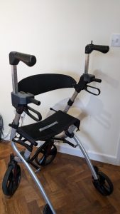 His walker is used to aid his recovery under the guidance of a physiotherapist. But to provide the correct posture, the handles need to be raised by 2-3 inches. He has trialled alternative larger rollators but he did not get on with them, and is keen to keep one he knows he can walk with. He keeps the brakes on when using the rollator – it is used more like a walking frame.