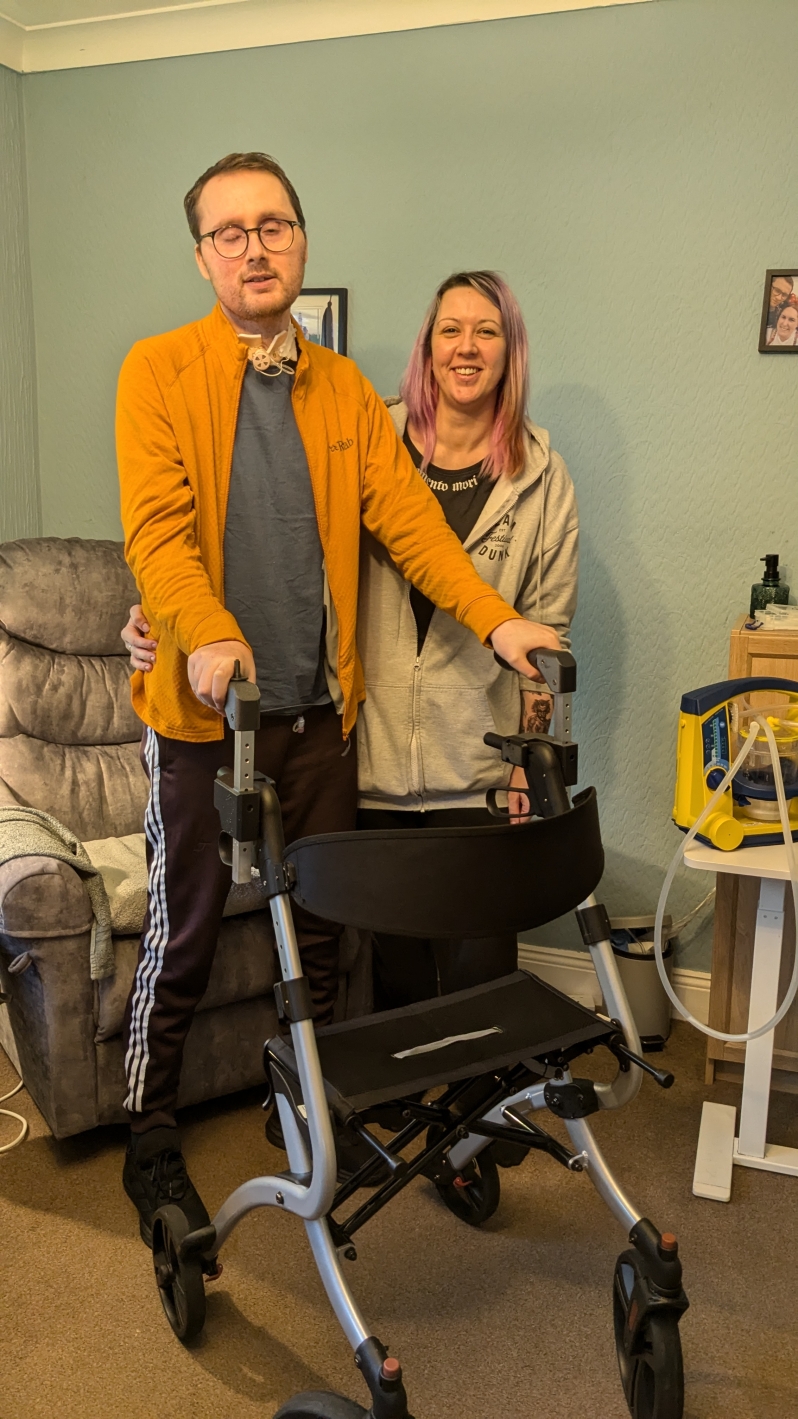 Following a brain tumour removal and subsequent hypoxic brain injury Matt has significant disturbance to his vision, balance and coordination and vestibular system. He also has significantly reduced proprioception in his right leg. He needs assistance to walk (including 2 carers when walking outdoors).