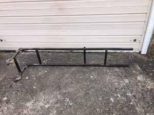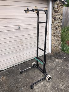 A frame of 25 mmx 2mm mild steel box section has been welded together and supports a counterweight system to unload the client’s arms.  Counterweights are housed within the frame and wires transmit their load, via pullies, to the client’s wrists.  Comfortable tubular bandage loops (with ‘tails’) slip around the wrists to transmit the loads.   The client uses the tails on the wrist loops to pull the loops down when she wants to slip them onto her wrists; she prefers this to a system of quarter turn locks to keep the counterweights in the upper location whilst she places her hands in the loops.  The frame has not been painted as the client now relies on it so much that she does not want to let go of it.  Similarly, the large wheels, lashed-up at the rear of the frame to make frame movement easier on carpet, have not been finalised. The client finds that this device is fully effective in enabling her to eat and drink ‘normally’ at the table.   The client also uses the frame for arm mobility exercises and finds that it enables her to write normally at the table again .