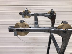 A frame of 25 mmx 2mm mild steel box section has been welded together and supports a counterweight system to unload the client’s arms.  Counterweights are housed within the frame and wires transmit their load, via pullies, to the client’s wrists.  Comfortable tubular bandage loops (with ‘tails’) slip around the wrists to transmit the loads.   The client uses the tails on the wrist loops to pull the loops down when she wants to slip them onto her wrists; she prefers this to a system of quarter turn locks to keep the counterweights in the upper location whilst she places her hands in the loops.  The frame has not been painted as the client now relies on it so much that she does not want to let go of it.  Similarly, the large wheels, lashed-up at the rear of the frame to make frame movement easier on carpet, have not been finalised. The client finds that this device is fully effective in enabling her to eat and drink ‘normally’ at the table.   The client also uses the frame for arm mobility exercises and finds that it enables her to write normally at the table again .