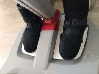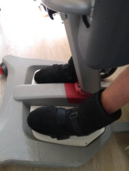 A Molift Raiser 205 is a type of hoist for lifting someone from a seated position. However, the client’s condition meant that her feet were prone to twisting and moving out of position for lifting which was uncomfortable for her. Her OT had already come up with a good idea of trying a type of plastic medical sandal secured down with velcro but these tended to twist off during lifting too.