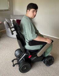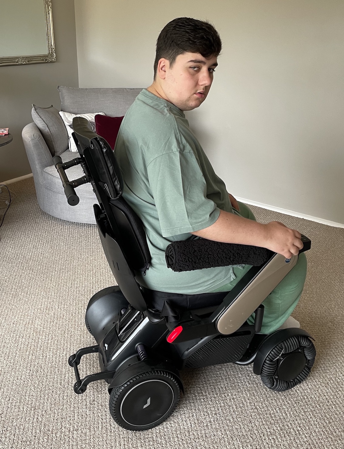 Jake and his family had chosen a very impressive and stylist new motorised wheelchair, the WHILL C2.  However, it needed some modification to suit his frame and their specific needs.  Unfortunately there is very limited adjustment available in the chair as it is supplied, only a small vertical movement in the height of the seat, the armrests and the seat back.  Once these were at their maximum Jake still had very little support as the built-in backrest only reached to about the small of his back.  Also, with such a low back there was no comfortable way for anyone to push the chair when in free-wheel mode, whether it was occupied or not.  What was needed was a new back attachment that provided better support and preferably that enabled it to be manoeuvred without using the motor and joystick.  One other constraint was that the seat back, complete with new extension, should not project beyond the chair front when folded down in order to facilitate transportation by car.