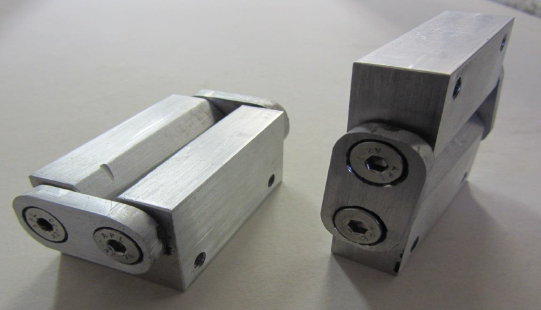 The client has an aluminium folding ramp but when unfolded a hinge protrudes upwards and interferes with his wheelchair footplate. Special double-pivot hinges were made so that they sit flat.