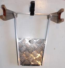 The aluminium plate of the ‘Pushchair Link’ hooks over the rear edge of the wheelchair footplate and is clamped securely in place. The rear pushchair wheels and axle fit into the bespoke bracket. The rear wheels of the pram are then released and stored in the pushchair pocket. A safety strap is clipped in place to prevent the pushchair from becoming detached from the ‘pushchair link’.