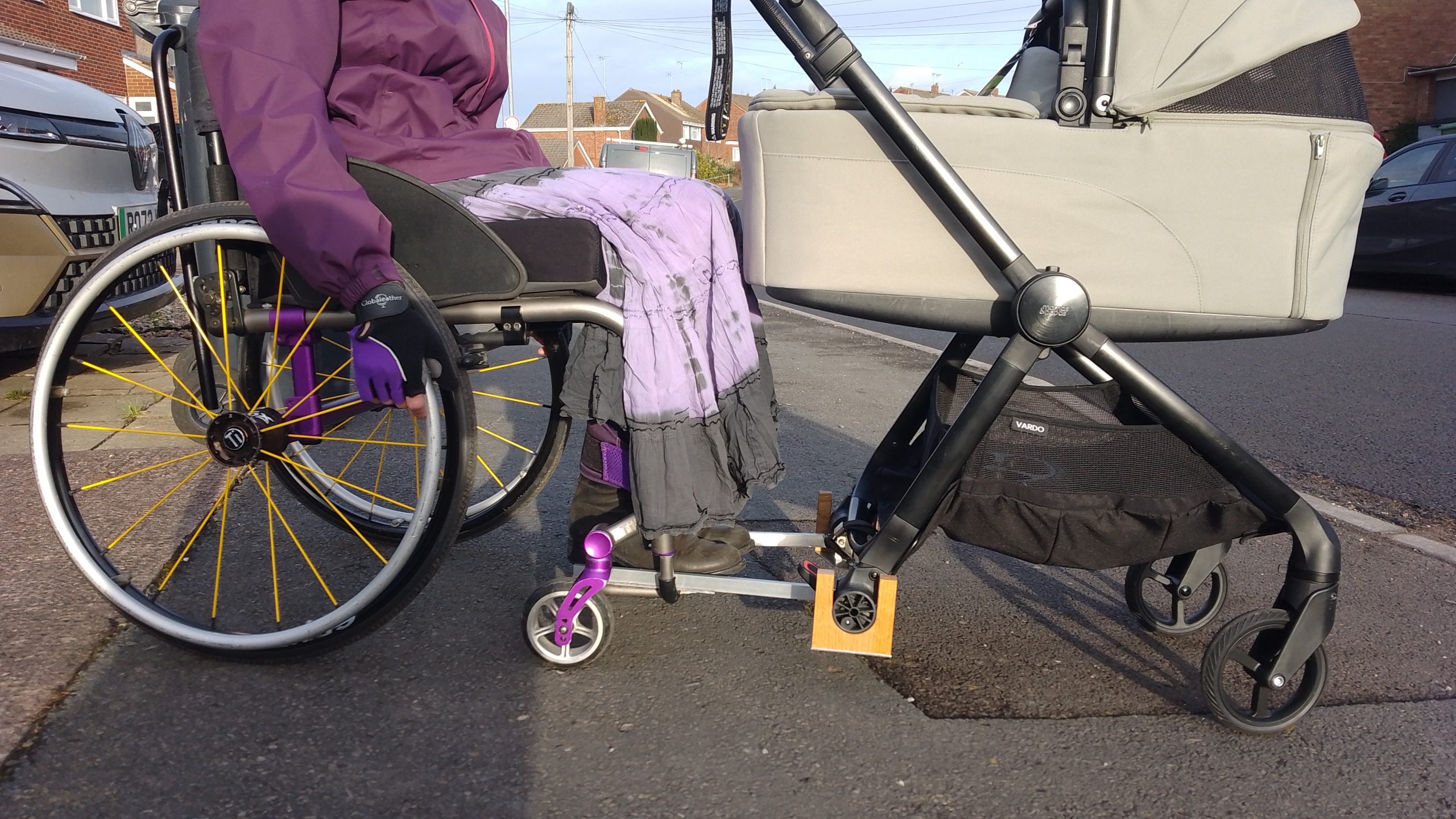 ‘Pushchair Link’ for attaching a pushchair to a parent’s wheelchair.
