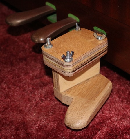 A plywood bracket was clamped to the pedal to lower its action to near floor level. Because the upper surface of the pedal was curved, the lower surface of the top half of the bracket was hollowed out. To ensure it conformed exactly to the complex shape of the pedal, the cavity was part-filled with epoxy filler, the pedal covered in cling-film and the bracket bolted in place while it set. Once set, the excess epoxy and film were removed. The assembly then clamped firmly to the pedal.