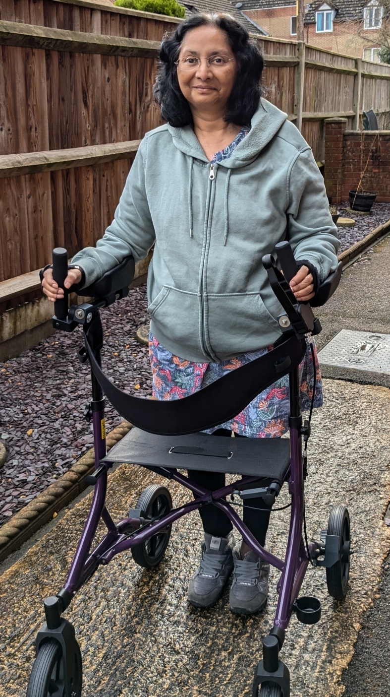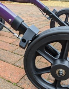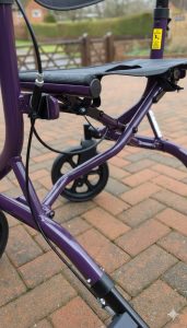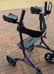 The client needed a rollator to give her more confidence when walking outside. She suffers with several conditions which limit her mobility. Significantly she has arthritis in both hands which limits her hand mobility and grip strength. A rollator with gutter arm supports and upright handles would be most suitable. However she couldn’t find one that was small and light enough for her to lift into the car. The machine she bought was lightweight but she couldn’t use the ‘conventional’ horizontal handles and brakes. She requested REMAP’s help to convert it to a suitable configuration.