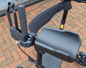 One of the existing brake levers was fitted on the left and a commercial split cable was attached. This converted the single cable in the brake lever into two separate cables – one for each brake shoe. The use of the existing brake lever retained the dual function i.e. pull up for progressive braking and push down for brake lock. A pair of commercial arm rests where fitted, again using 3D printed adapters.
