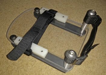 Harrogate and Ripon Group engineer Jon Parlby made a foot plate that clamps over the existing foot rest and provides a heel strap and foot locating strap to prevent this involuntary movement. Note that the client only uses the wheelchair when being moved so the duration of use is relatively short.