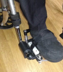 Our client’s foot remains safely secured when she is being moved around in her wheelchair.